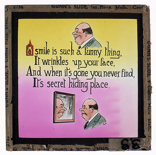 Text, on slide: 'A smile is such a funny thing,/It wrinkles up your face,/And when it's gone you never find,/It's secret hiding place'. Text, edge of slide: 'GUNN'S SLIDE, 9 Collins Place, Melb. Cent. 2736'.
