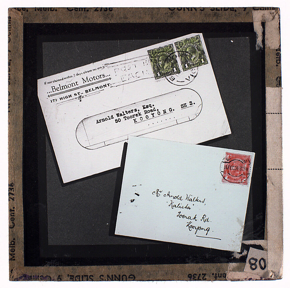 Colour glass lantern slide of a photograph of two envelopes addressed to Arnold Walters, Toorak Road, Kooyong, 1934, Victoria. Made by Alex. Gunn & Sons, Melbourne Victoria, circa 1930s.