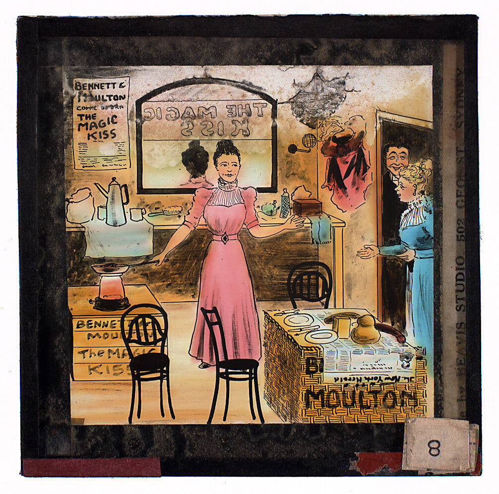 Lantern slide of colour sketch of a house or stage scene, apparently depicting a comic opera, Mebbet & Moulton's 'The Magic Kiss'. Made by Beavis Studio, Sydney, New South Wales, circa 1930s-1940s.