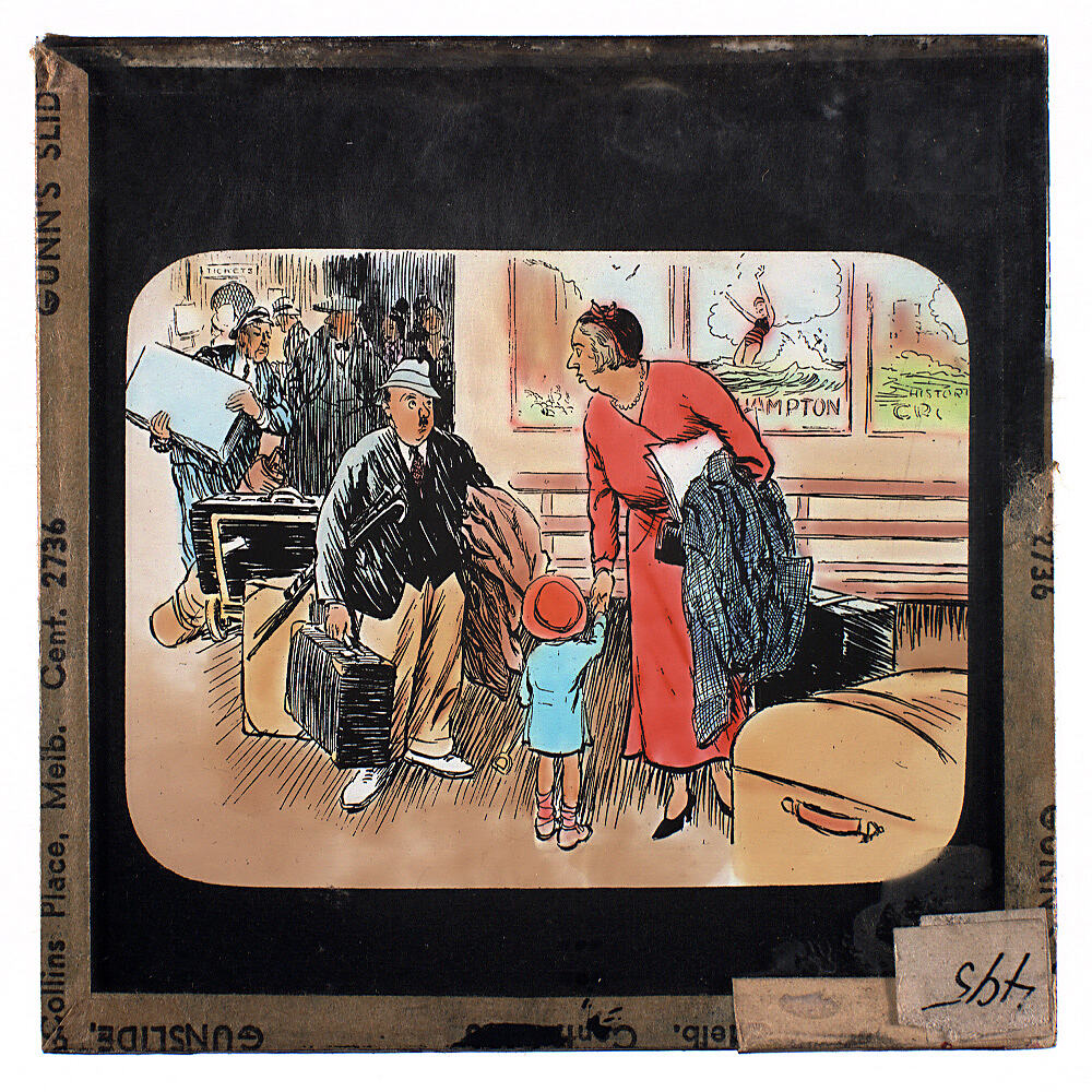 Colour glass lantern slide of a cartoon of a man, woman and child at a railway station. Made by Alex. Gunn & Sons, Melbourne, Victoria, circa 1930s.