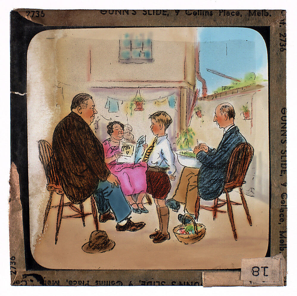 Colour glass lantern slide of a cartoon of a family group. The man is podding peas and the woman smoking and reading the paper; probably intended to indicate a switching of gender roles.. Made by Alex. Gunn & Sons, Melbourne, Victoria, circa 1930s.