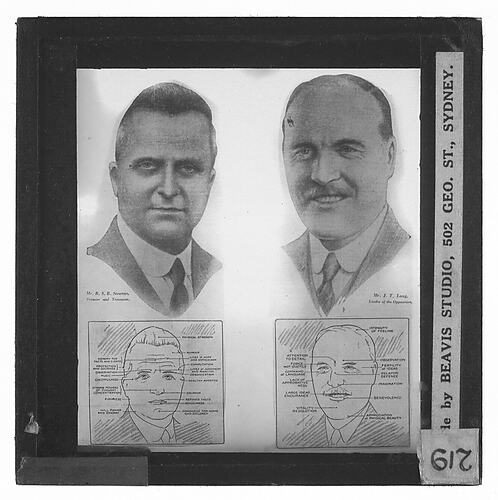Glass lantern slide of photographic portraits of Bertram S.B. Stevens, Premier of New South Wales and J.T. Lang, leader of the opposition, with skecthes characterising their physiognomy and imputed character. Stevens and Lang held these respective positions from 1932 to 1939. Made by Beavis Studio, George Street, Sydney, New South Wales, 1930s.