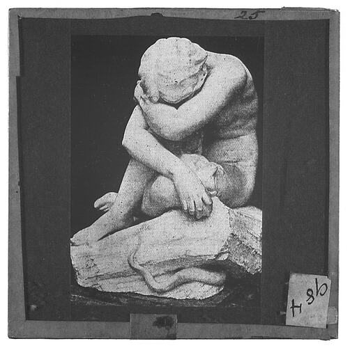 Lantern slide of a sculpture of a male, probably Adam, with serpent and apple.