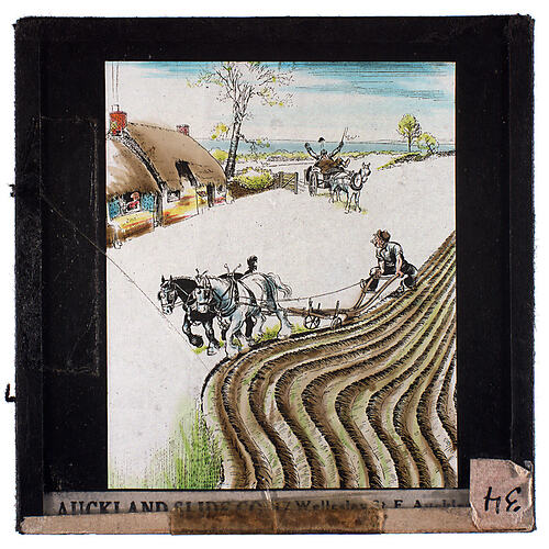 Lantern slide of a cartoon showing a farmhand ploughing a crooked field while ogling the farmer's wife. Made by Auckland Slide Co, Auckland, New Zealand, circa 1940s.