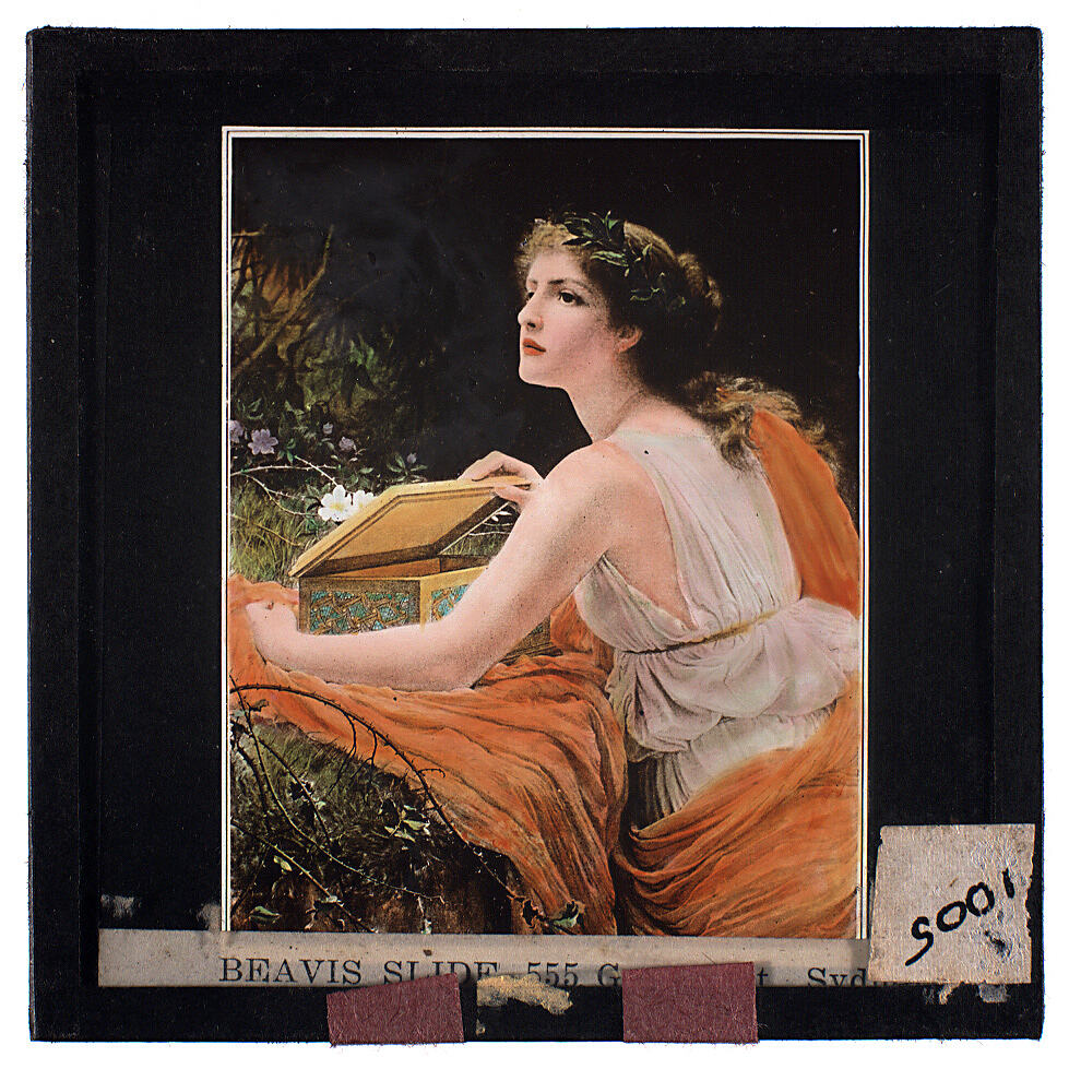 Lantern slide of photograph of a woman depicted in classical robes. Made by Beavis Studio, Sydney, New South Wales, circaa 1930s-1940s.