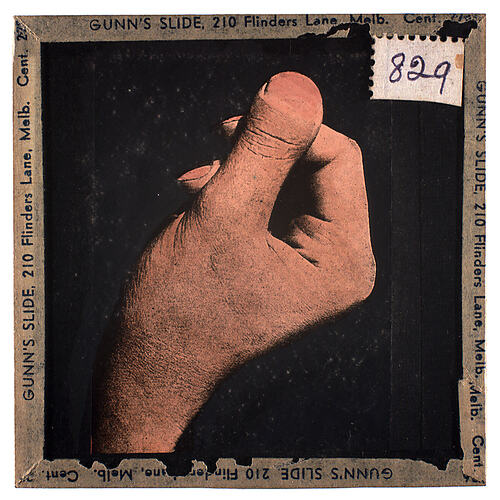 Lantern slide of photograph of a hand, showing thumb. Made by Alex. Gunn & Sons, Melbourne, Victoria, circa 1940s.
