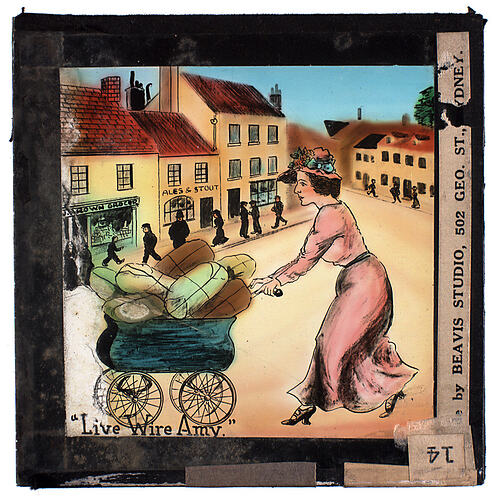 Lantern slide of a cartoon of a woman actively pushing a pram of parcels in the street. Made by Beavis Studios, Sydney, New South Wales, circa 1930s-1940s.