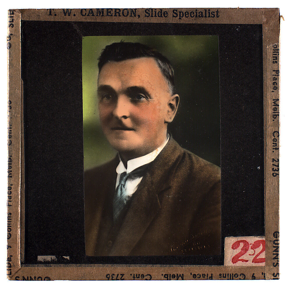 Text, side of slide: GUNN'S SLIDES, 9 Collins Place, Melb. /T.W. CAMERON, Slide Specialist. Text on attached label: '22'.