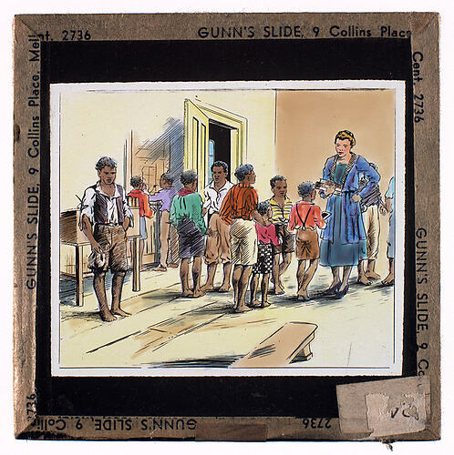 Colour glass lantern slide of a sketch depicting a white female teacher with indigenous boys in a classroom. The pupils are possibly intended to be Australian Aboriginal children. Made by Alex. Gunn & Sons, Melbourne, Victoria, circa 1930s.