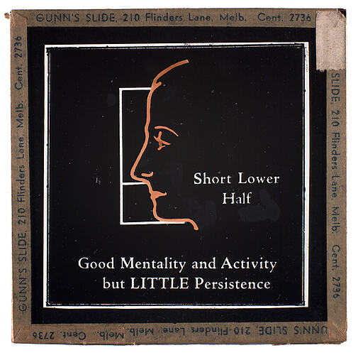 Text, on slide: Short Lower/Half/Good Mentality and Activity/but LITTLE Persistence. Text, edge of slide: GUNN'S SLIDE, 210 Flinders Lane, Melb., 2736.