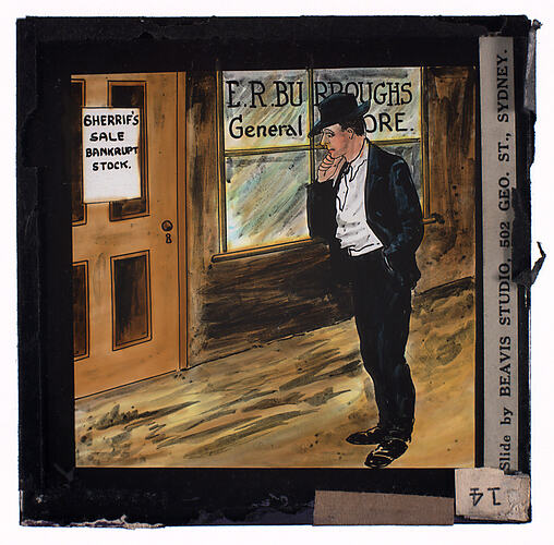 Text, on slide: SHERRIF'S/SALE/BANKRUPT/STOCK./E.R. BURROUGHS/General STORE./Slide by BEAVIS STUDIO, 502 GEO. ST. SYDNEY. Ttext on attached label: '14'.