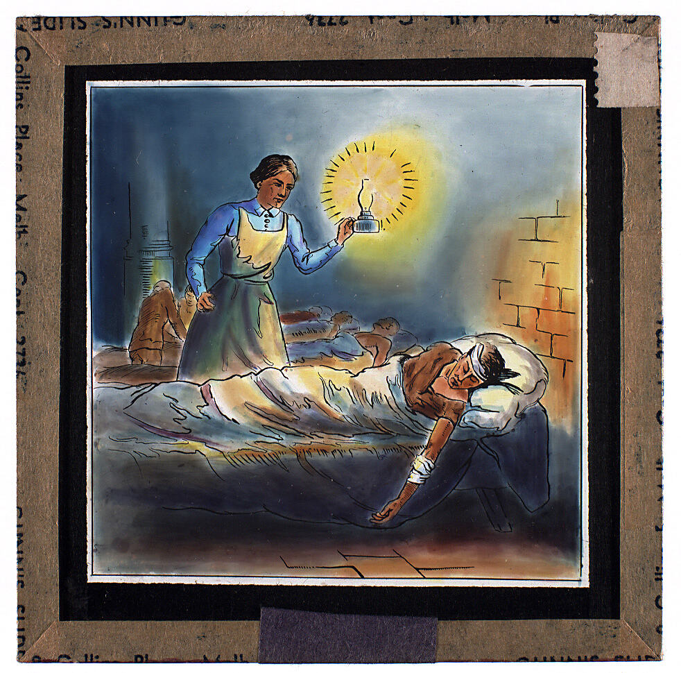 Colour glass lantern slide of an illustration of nurse with a patient. Possibly intended as a depiction of Florence Hightingale in the Crimea, Made by Alex. Gunn & Sons, Melbourne, Victoria, circa 1930s.
