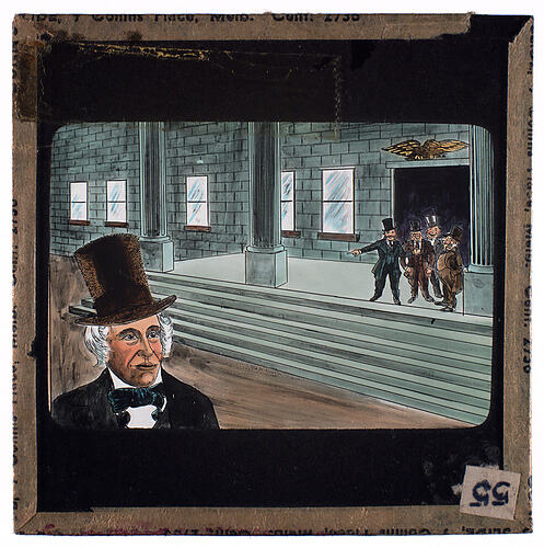 Text: GUNN'S SLIDE, 9 Collins Place, Melb. Cent. 2736. Text on attached label: '55'.