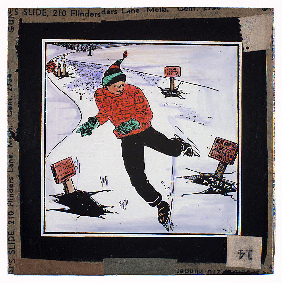 Lantern slide of cartoon sketch of a man skating, avoiding dangerous habits such as 'Indifference' and 'Waste of Time'. Made by Alex. Gunn & Sons, Melbourne, Victoria, circa 1940s.