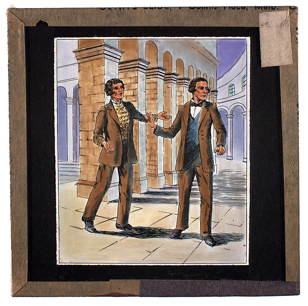 Colour glass lantern slide of a sketch of two men in a classically designed building. Made by Alex. Gunn & Sons, Melbourne Victoria, circa 1930s.