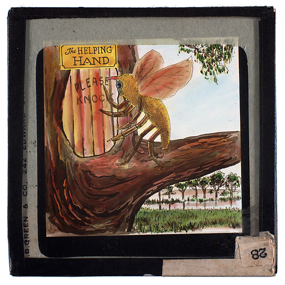 Lantern slide of coloured drawing of an insect depicted as a 'Helping Hand'. Made by T.W. Cameron, Melbourne, Victoria, circa 1930s-1940s.