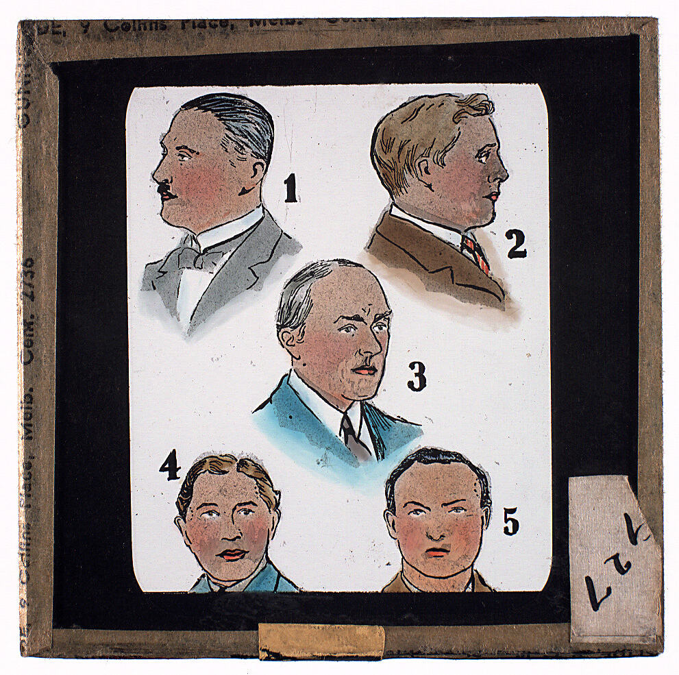 Lantern slide of illustrations of five male heads. Made by Alex. Gunn & Sons, Melbourne, Victoria, circa 1930s.