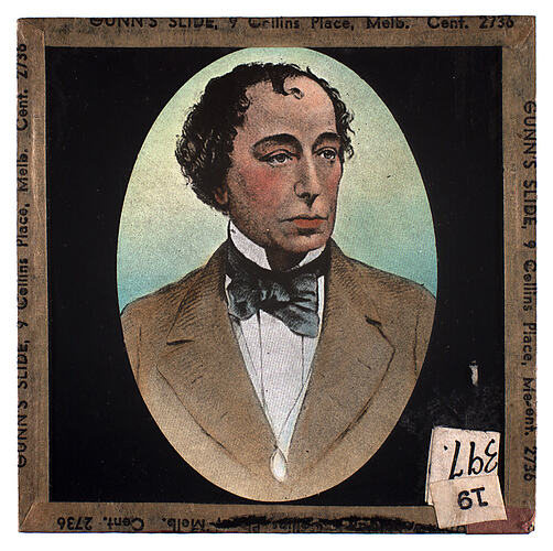 Lantern slide of photographic portrait of Benjamin Disraeli, British statesman and novelist who was twice prime minister of the United Kingdom (1868, 1874-80). Made by Alex. Gunn & Sons, Melbourne, Victoria, circa 1930s.