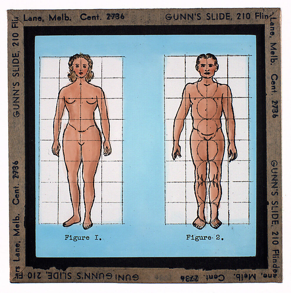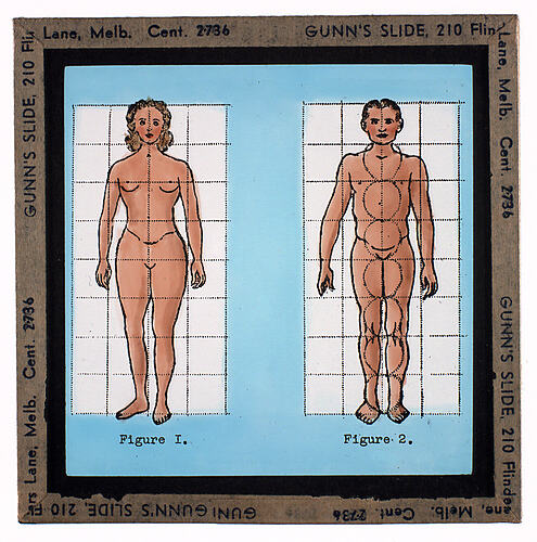 Lantern slide of drawings of the male and female body, with grid lines. Made by Alex Gunn & Sons, Melbourne, Victoria, circa 1940s.