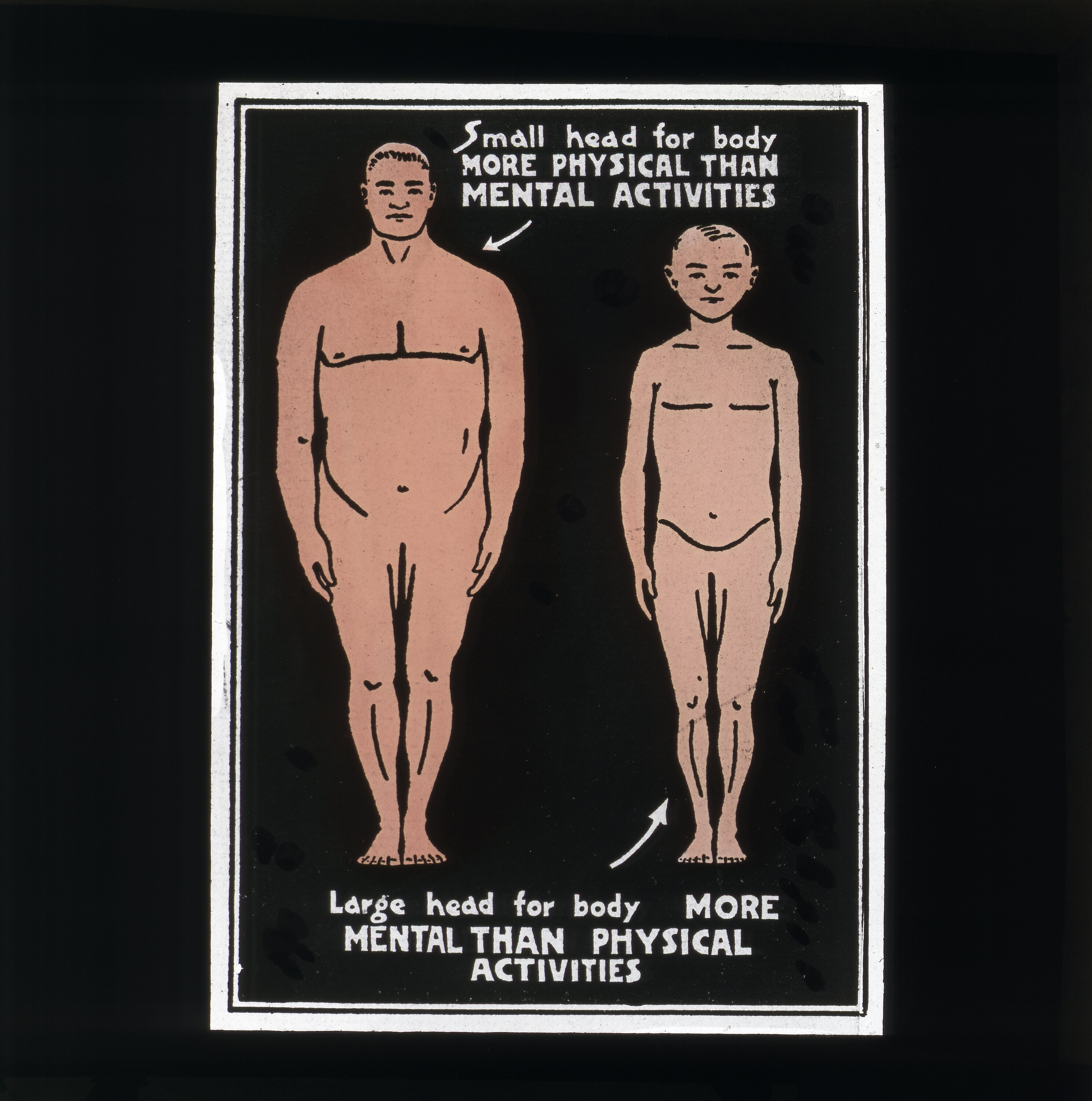 Colour glass lantern slide showing sketches of two different body types and relationship of size of head to body, ascribing attibutes to these. Made by Alex. Gunn & Sons, Melbourne, Victoria, circa 1940s-1950s.