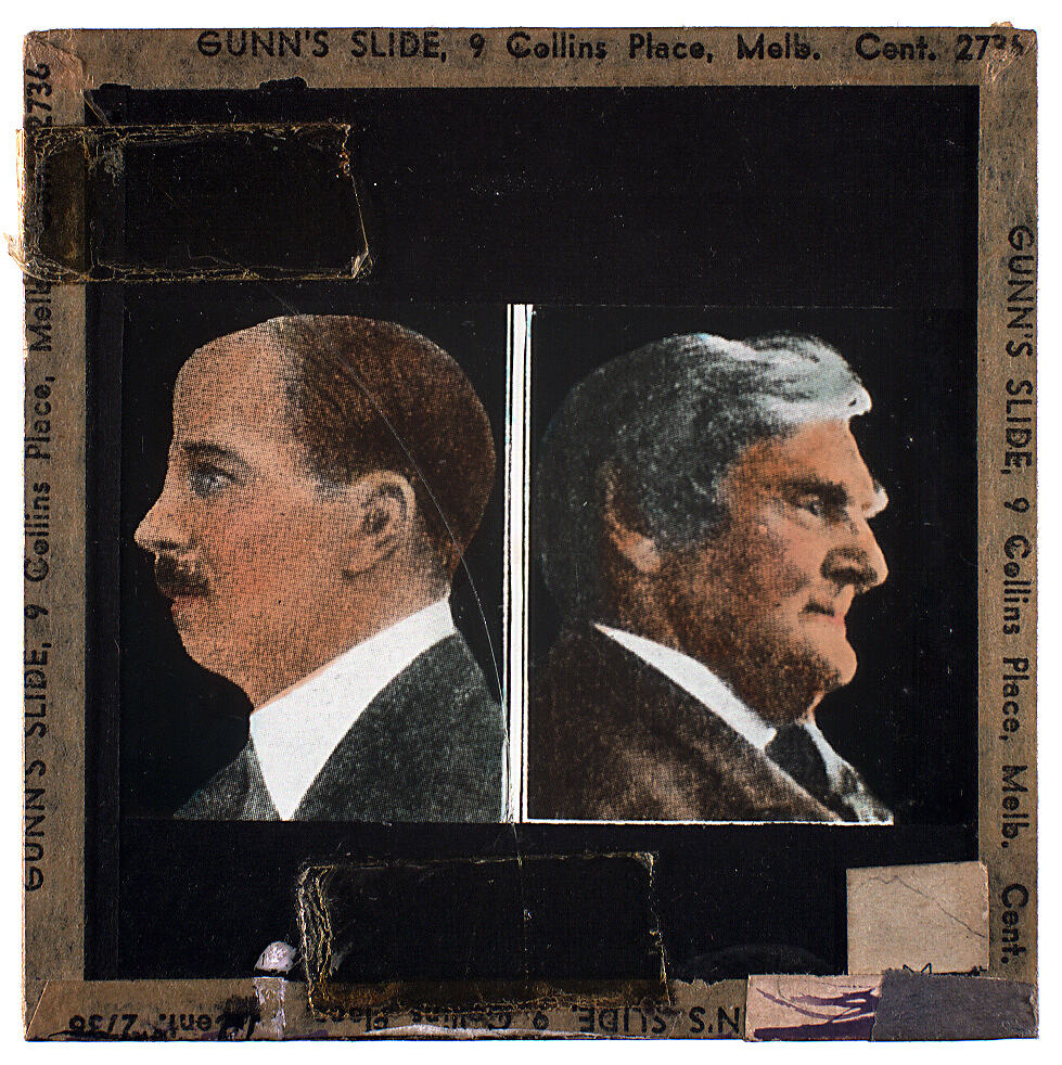 Colour glass lantern slide of photographs of two male heads. Made by Alex. Gunn & Sons, Melbourne Victoria, circa 1930s.