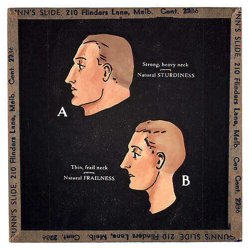 Text, on slide: Strong, heavy neck/Natural STURDINESS/A/Thin, frail neck/Natural FRAILNESS/B. Text, edge of slide: GUNN'S SLIDE, 210 Flinders Lane, Melb. Cent. 2736.