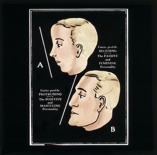 Coloured glass lantern slide containing drawings of two heads marked 'A' and 'B'. Next to drawing 'A' is written 'Entire profile receding. The passive and feminine personality'. Next to drawing 'B' is written 'Entire profile protruding. The positive and masculine personality'.