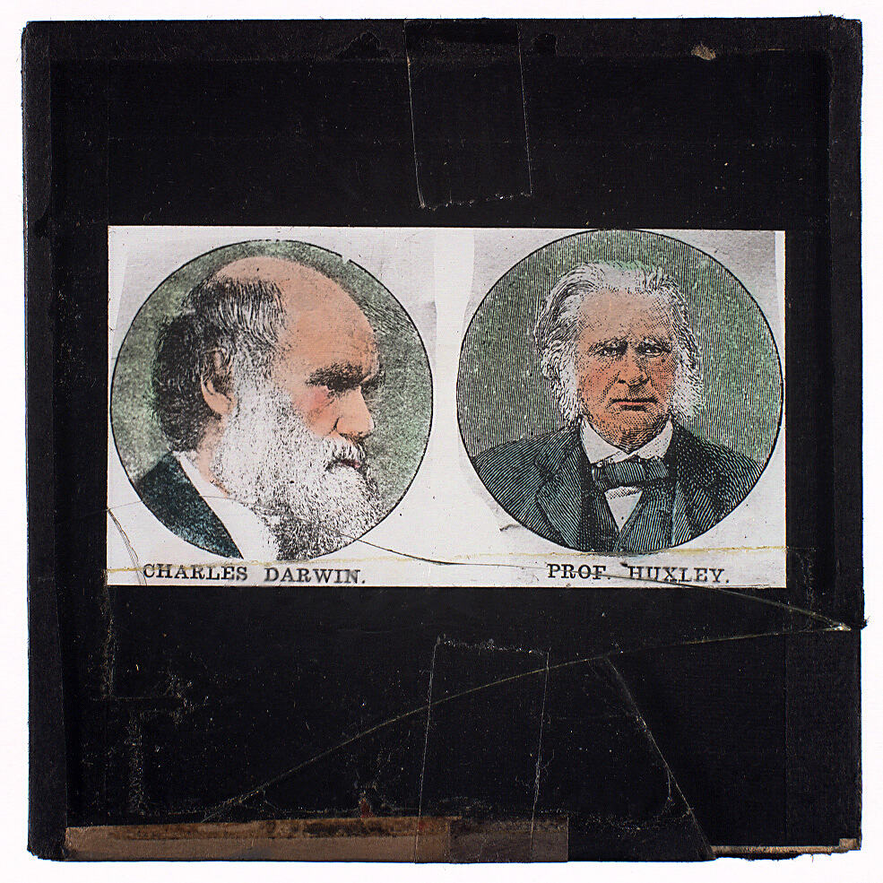 Lantern slide of coloured engraving portraits of Charles Darwin and Thomas Henry Huxley.