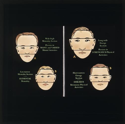 Lantern slide of four adult heads, used to illustrate relationship between physiognomy, mentality and energy. Made by Alex. Gunn & Sons, Melbourne, Victoria, circa 1940s.