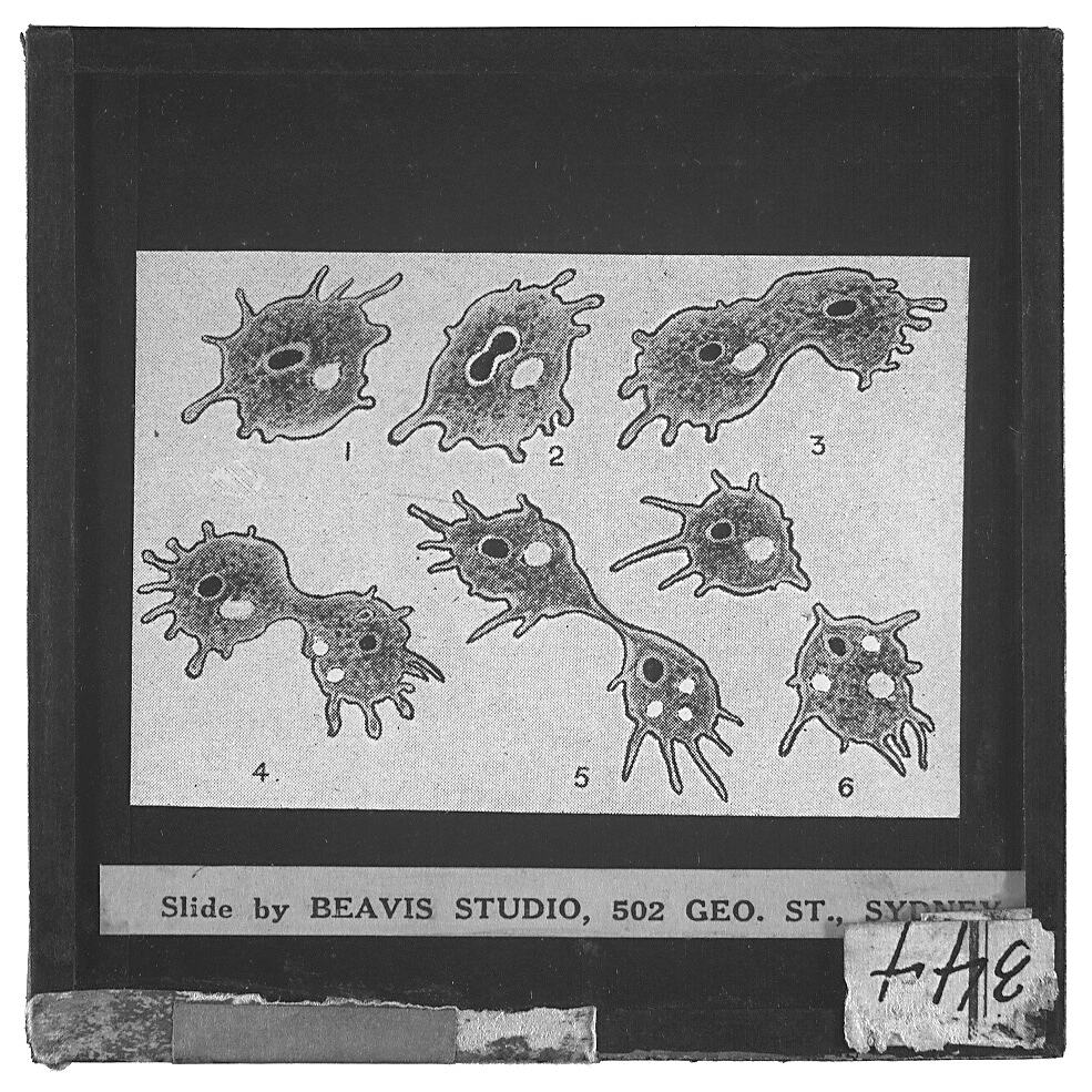 Lantern slide showing process of cell division through six stages, reproduced from a text book. Slide produced by Beavis Studio, Sydney, New South Wales, circa 1930s-1940s.