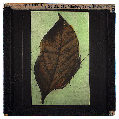 Colour glass lantern slide of a moth camouflaged as a leaf. Made by Alex. Gunn & Sons, Melbourne Victoria, circa 1940s.