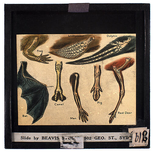Captions on limbs: 'Frog, Bat, Camel, Ichthyosaur, Man, Dolphin, Pig, Red Deer'. Text, on slide: 'Slide by BEAVIS STUDIO, 502 GEO. ST., SYDNEY'. Text on attached label: '819'.