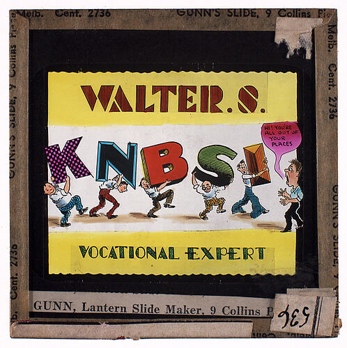 Text, on slide: WALTER S./KNBSI/VOCATIONAL EXPERT. Text, edge of slide: GUNN'S SLIDE, 9 Collins Place, Melb. Cent. 2736. Text on attached label: '536'.
