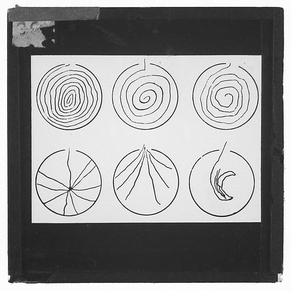 Colour glass lantern slide showing six line drawings or doodles, perhaps intended to reflect different personality types.