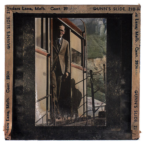 Colour glass lantern slide of a man standing in the doorway of a railway carriage or funicular. It is most likely that this is a portrait of Walter S. Binks, vocational guidance lecturer. The photograph appears to have been taken during a trip to New Zealand.