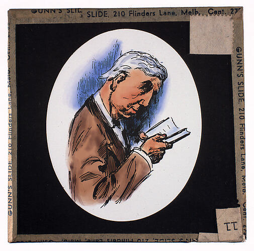 Lantern slide of portrait sketch of a man. Made by Alex. Gunn & Sons, Melbourne, Victoria, circa 1940s.