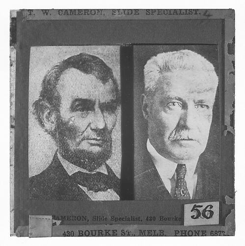 Lantern slide of portraits of Abrahan Lincoln and unidentified man, produced by T.W. Cameron, Melbourne, Victoria, circa 1930s.