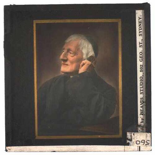 Lantern slide of portrait photograph of Cardinal John Henry Newman. Made after his death by Beavis Studio, Sydney, New South Wales, circa 1930s-1940s.
