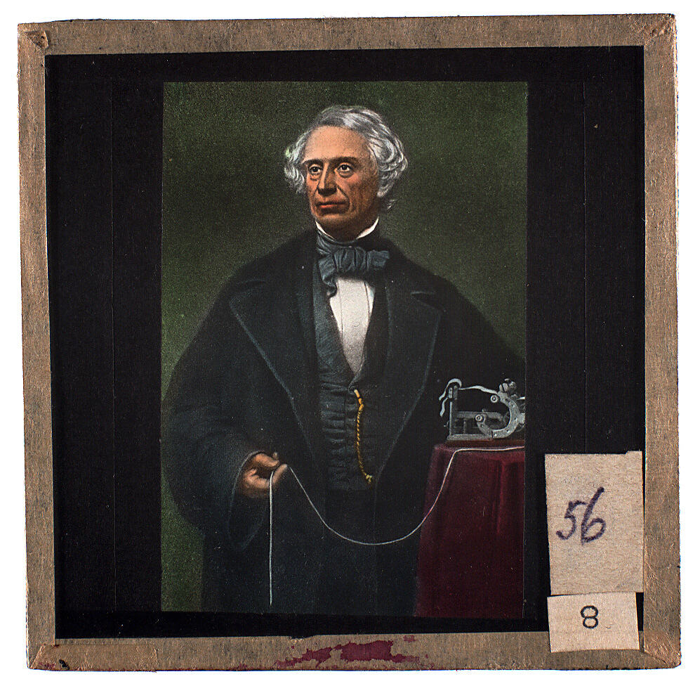 A picture of a man with white hair, wearing a coat, waistcoat and necktie standing up. In his right hand is a piece of string which appears to be attached to some sort of small contraption on the table next to him.