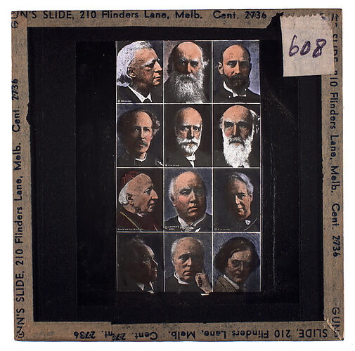 Colour glass lantern slide of a twelve male portraits. Made by Alex. Gunn & Sons, Melbourne, Victoria, circa 1940s.