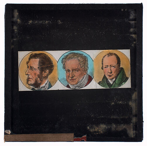 Colour glass lantern slide of three male portraits.