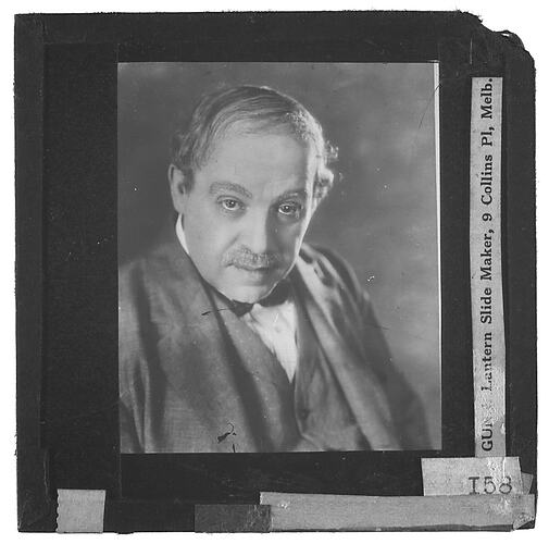 Lantern slide of photographic portrait of a man. Made by Alex. Gunn & Sons, Melbourne, Victoria, circa 1930s.