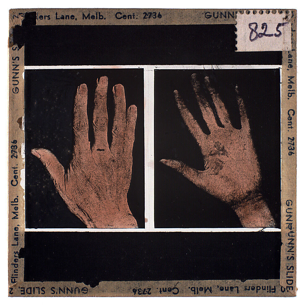 Colour glass lantern slide of a photograph of two hands, one broad and the other fine with narrow fingers. Made by Alex. Gunn & Sons, Melbourne, Victoria, circa 1940s.