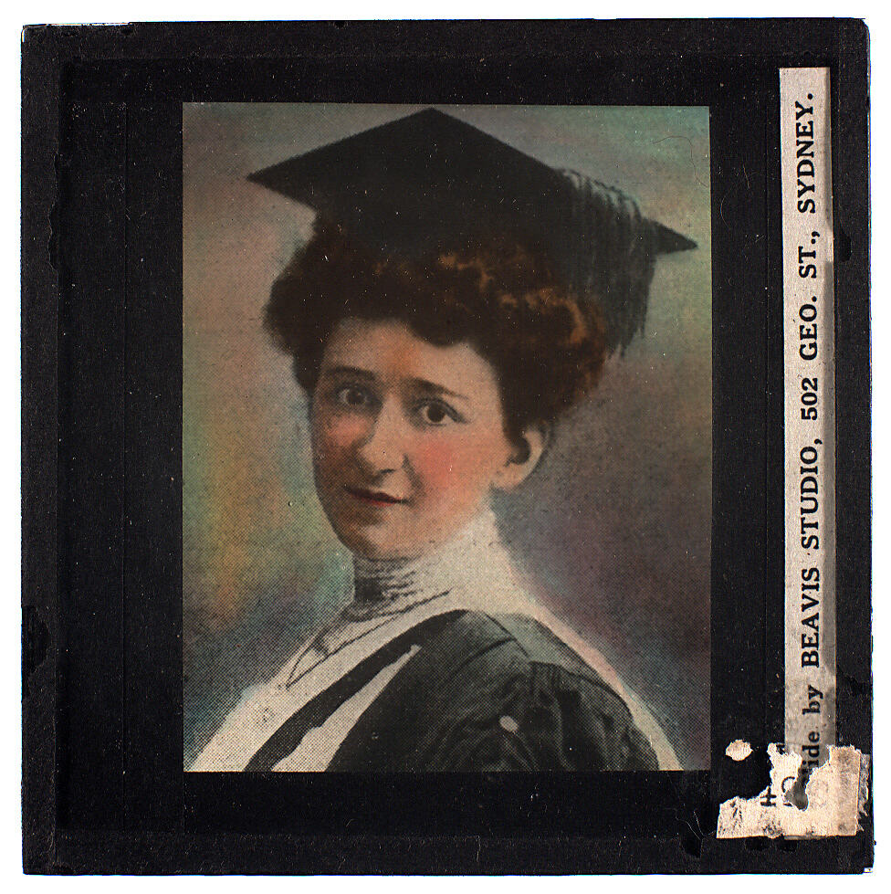 Lantern slide of hand coloured photograph of woman in academic gown and cap. Made by Beavis Studio, Sydney, New South Wales, circa 1930s-1940s.