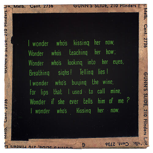 Text, on slide: I wonder who's kissing her now,/Wonder who's teaching her how,/Wonder who's looking into her eyes,/Breathing sighs! Telling lies!/I wonder who's buying the wine,/For lips that I used to call mine,/Wonder if she ever tells him of me?/I wonder who's kissing her now. Text, edge of slide: GUNN'S SLIDE, 210 Flinders Lane, Melb. Cent. 2736.
