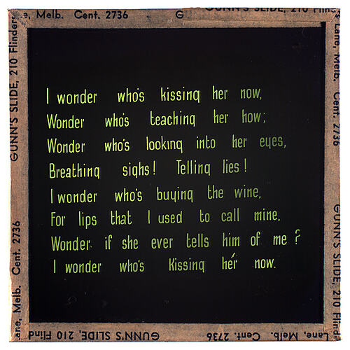 Lantern slide of the text of a song, 'I Wonder Who's Kissing Her Now?' Made by Alex Gunn & Sons, Melbourne, Victoria, circa 1940s.