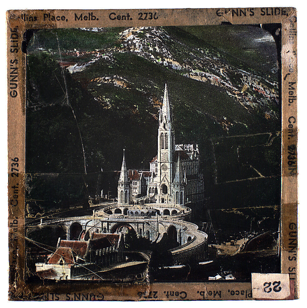 Text, on slide: GUNN'S SLIDE, 9 Collins Place, Melb. Cent. 2736. Text on attached label: '22'.