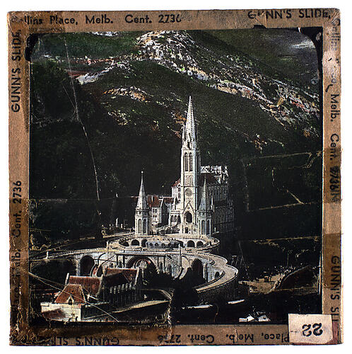 Lantern slide of a church at the foot of a mountain, possibly in Switzerland. Made by Alex. Gunn & Sons, Melbourne, Victoria, circa 1930s.