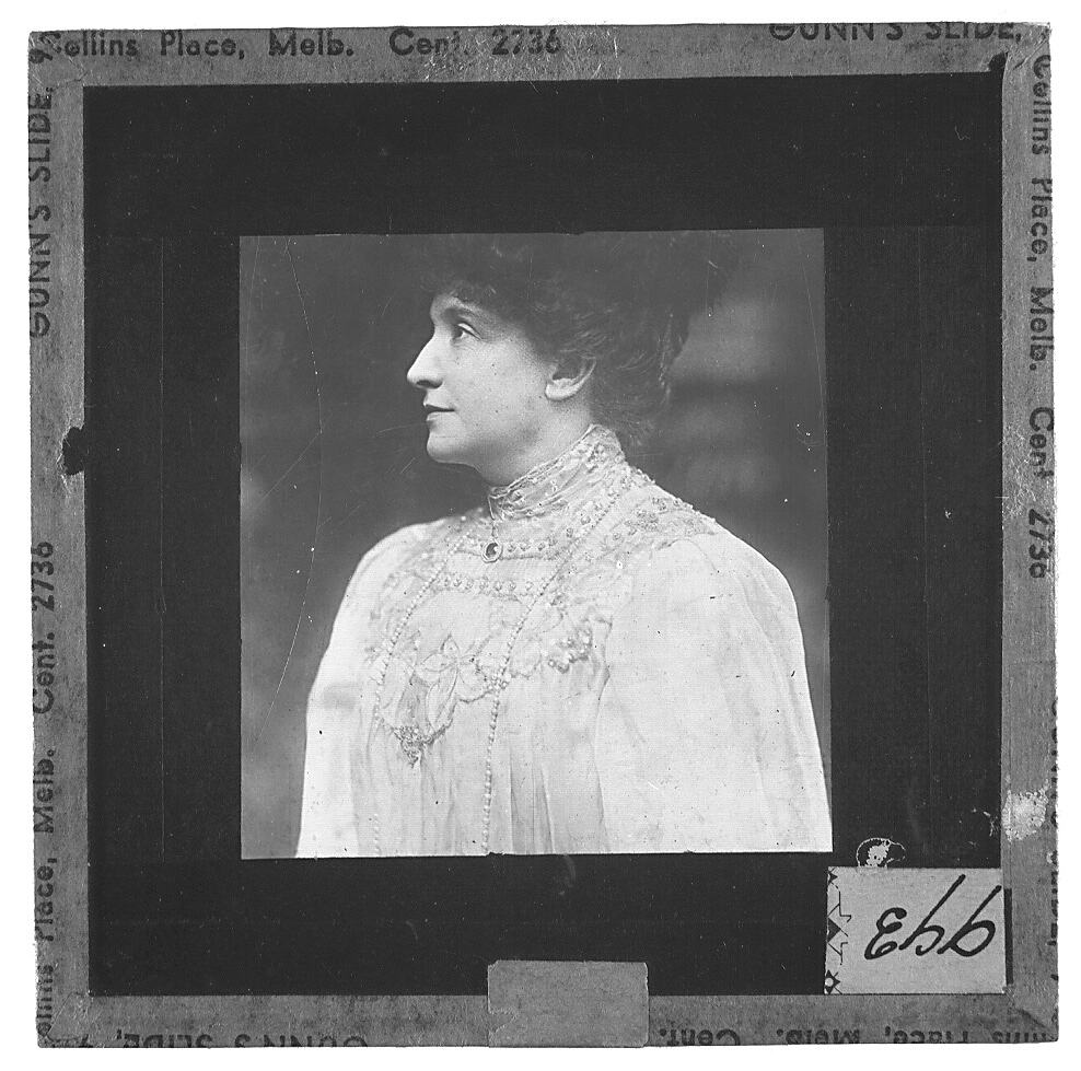 Lantern slide of photograph of female. Made by Alex. Gunn & Son, Melbourne, Victoria, circa 1930s.