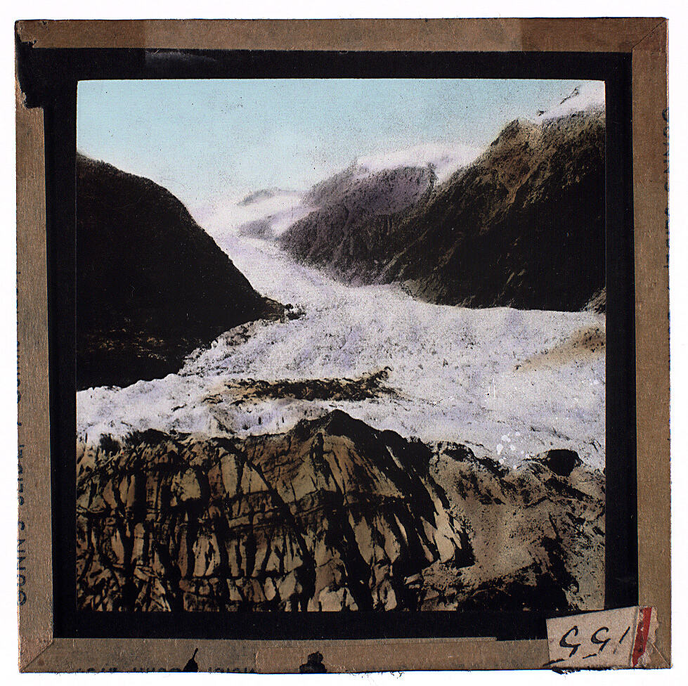 Colour glass lantern slide of a glacier and mountains. Made by Alex. Gunn & Sons, Melbourne, Victoria, circa 1930s.